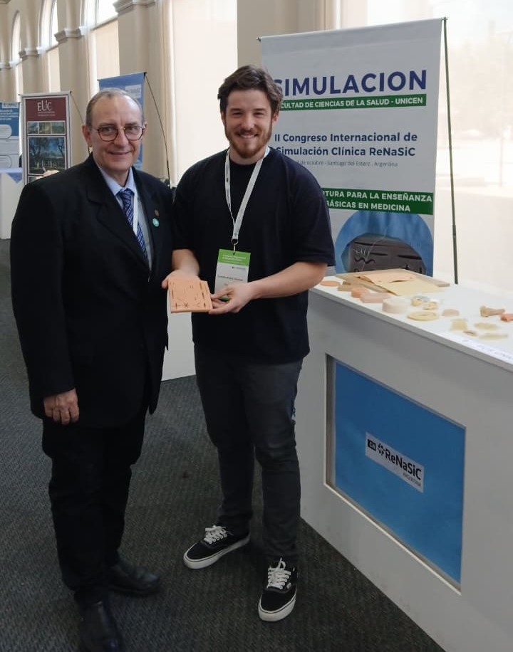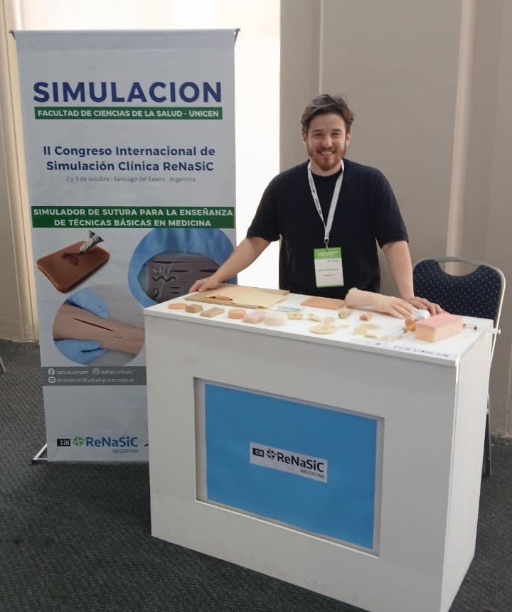 Durante el congreso, Pablo participó además con un stand de exhibición, donde presentó distintos simuladores de sutura y como fue el proceso para encontrar el modelo de simulador adecuado, iniciativas que buscan potenciar la enseñanza basada en simulación clínica con materiales accesibles y adaptados a las necesidades locales. En el stand estuvo presente el Decano de la Facultad de Ciencias Médicas de la Universidad Nacional de Santiago del Estero (UNSE) Eduardo Allub, el presidente del CIN Oscar Alpa, el director de la ReNaSic Gabriel Muntaabski, entre otras autoridades nacionales.